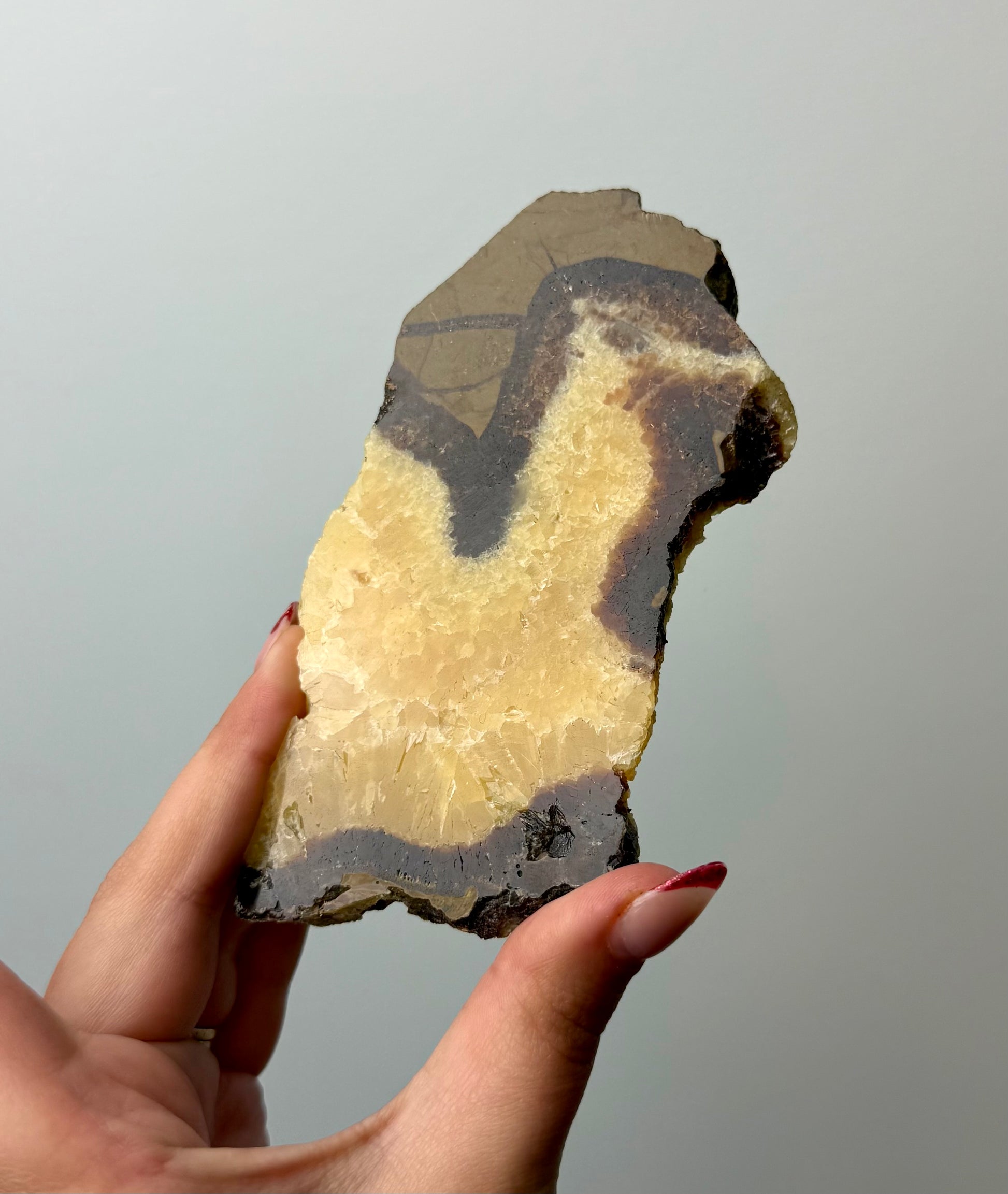 Septarian, also called Dragon Stone, is a tri color concretion composed of Aragonite (the brown), Calcite, (the yellow), and Limestone (the grey). This stone is known as a shield, you can carry this stone around to protect your aura and energy.